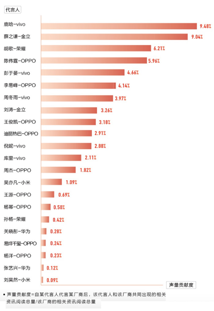 从最后的声量贡献比来看,薛之谦在所有代言人之中也确实名列前茅。毕竟薛之谦因为自身丑闻,最终给品牌也拉高了声量。但对手机品牌而言,代言人出现丑闻属于不可控因素,很难说是一件好事。