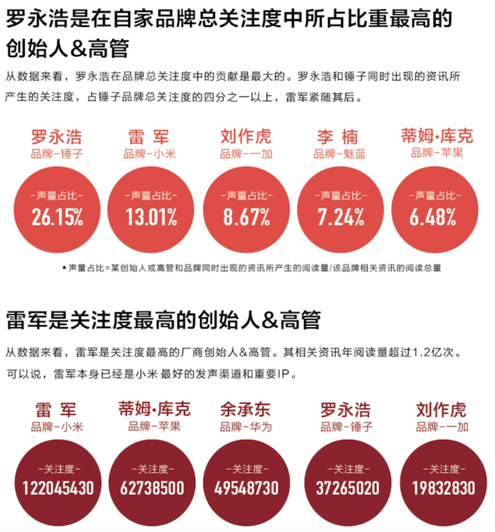 黑高管这个套路是小米、锤子这类手机厂商最擅长的,而且从市场反馈来看,也确实有一定效果。从《白皮书》来看,雷军、罗永浩在所有高管中是影响力最大的。小米和锤子两个厂商,对于企业高管的IP价值利用,可以说是淋漓尽致。