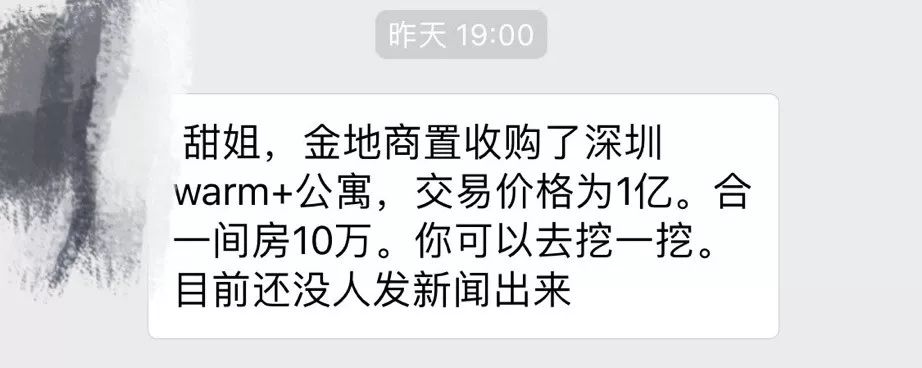 昨天,小编收到了一位从业多年的圈内朋友的一条微信。据其爆料,金地商置收购了深圳 warm+ 公寓,交易价格为 1 亿,合一间房 10 万。