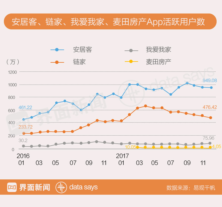近几年来,链家、我爱我家等房产中介都在加快推广自有电商平台,努力摆脱对58同城、赶集网等综合平台的依赖。易观千帆数据显示,2016年至今,链家、我爱我家等专业房产App的活跃用户数都出现了较大幅度的增长,但与“58系”的安居客相比仍然有较大差距。