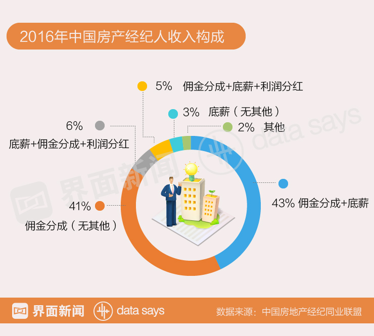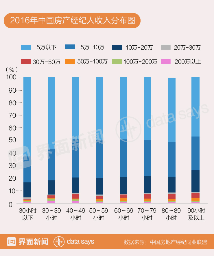 中国房地产经纪同业联盟数据显示,能得到传说中的百万年薪的房产经纪人并不多,约八成的经纪人年收入都在10万元以下,年收入不足5万元的房产经纪占到一半左右。