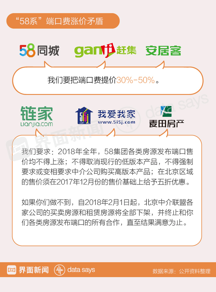 前不久,市场消息称,58同城(WUBA.NYSE)、赶集网、安居客等58集团旗下的房产电商平台将把端口费提高30%-50%。1月24日,北京中介联盟发文称,若58集团各类房源端口费不停止提价,自2018年2月1日起,北京中介联盟各家公司的买卖房源和租赁房源将全部下架,并终止所有合作。
