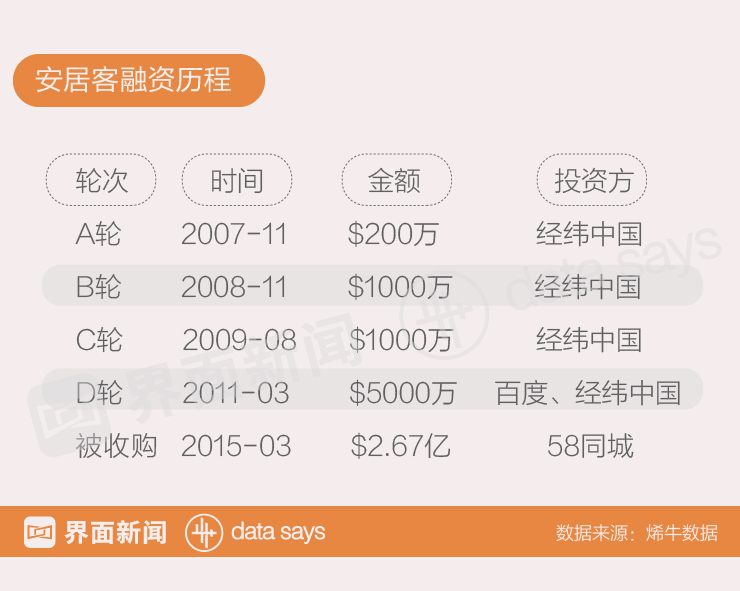 安居客成立于2007年,当年11月就获得了经纬中国200万美元的投资。当时中国房地产行业异常火爆,安居客凭借其新奇独特的经营模式获得了市场的青睐,流量不断增加。2011年,安居客获得百度领投的5000万美元D轮融资,经营版图迅速扩张,