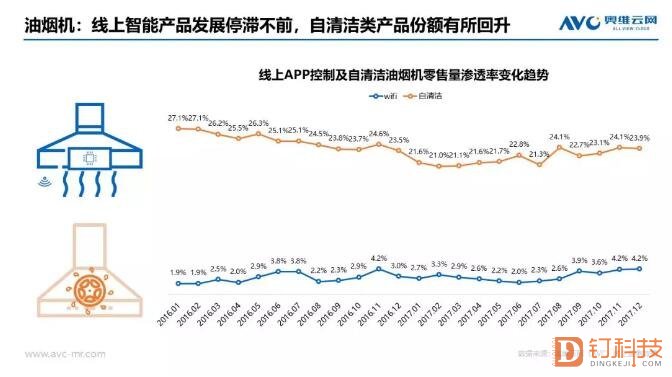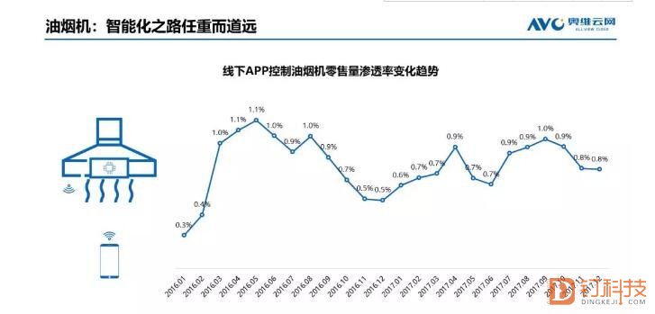 再看线下市场。钉科技注意到,App控制的油烟机零售量渗透率从2016年1月的0.3%,上升到2016年5月1.1%的最高点,此后直到2017年12月,都没有达到过这一水平,基本都在1%以下,最低点下探到2016年11月-12月的0.5%,2017年12月这一数字也仅仅有0.8%。