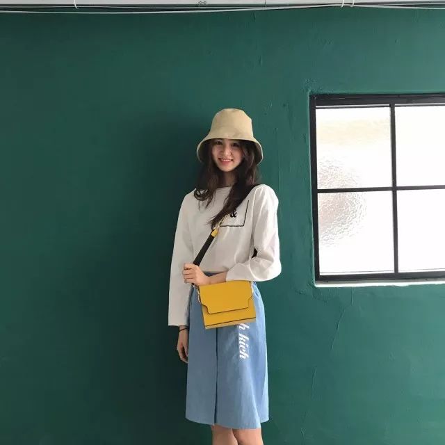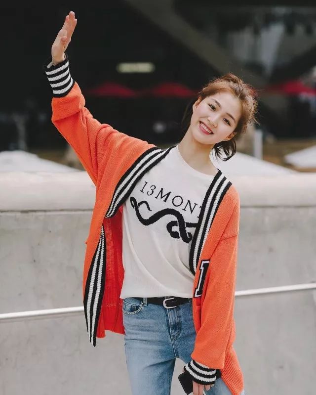 看下她对T恤的演绎,搭配牛仔裤最简约大方,凸显出活力,搭配橘色针织开衫非常显眼。