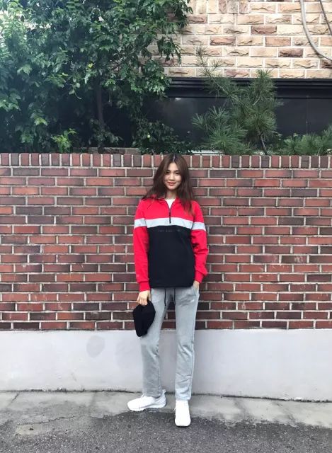 除了文艺浪漫的大衣look,偶尔演绎一下运动风也是不错的。