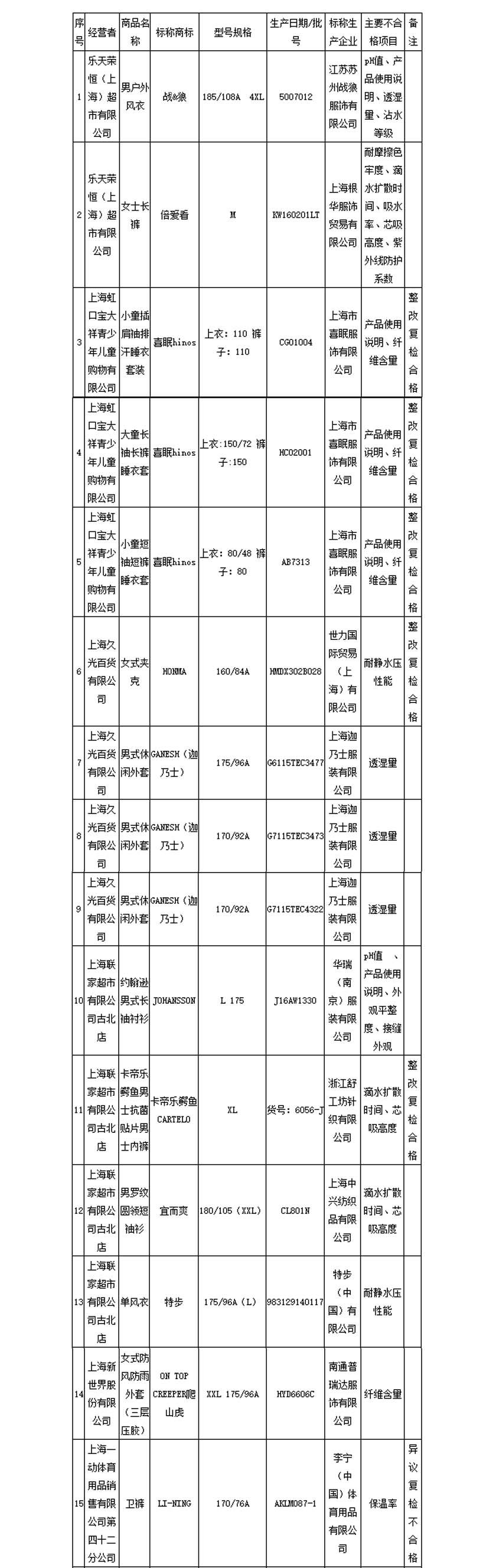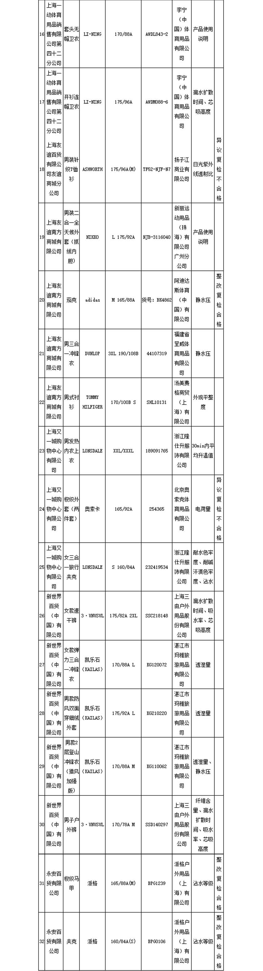 4、防(沾)水性不合格,有4个批次。上海又一城购物中心有限公司销售的标称由浙江隆仕升服饰有限公司生产(或供货)“LONSDALE ”牌“女三合一旅行夹克”(型号规格:160/84A(S);生产日期或批号:232419534),企业明示防泼水,但沾水等级实测为2-3级(标准值应≥3级),低于国家标准要求;永安百货有限公司销售的标称由派格户外用品(上海)有限公司生产(或供货)“派格”牌“梭织马甲”(型号规格:165/88A(M);生产日期或批号:BPG1239),企业明示拒水,但沾水等级实测为3-4级(标准值应≥4级),低于国家标准要求。沾水是指织物表面抵抗水润湿的能力,级数越高织物在受水喷淋后表面润湿量越小,有防水性能的织物可以短时间抵御小水量的喷淋而不会被润湿。该指标不合格,达不到防水功能。