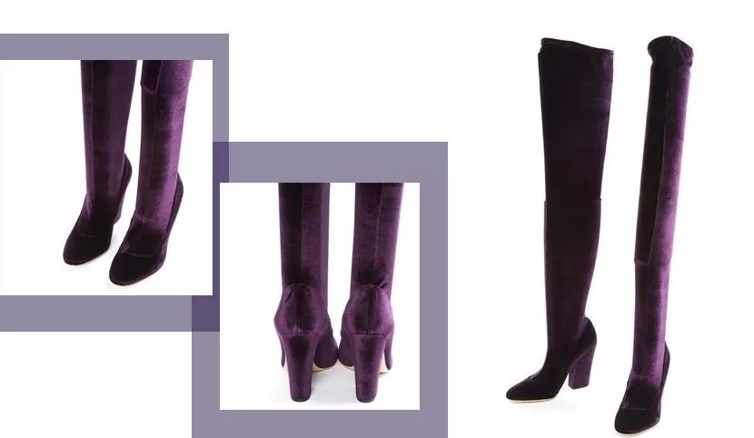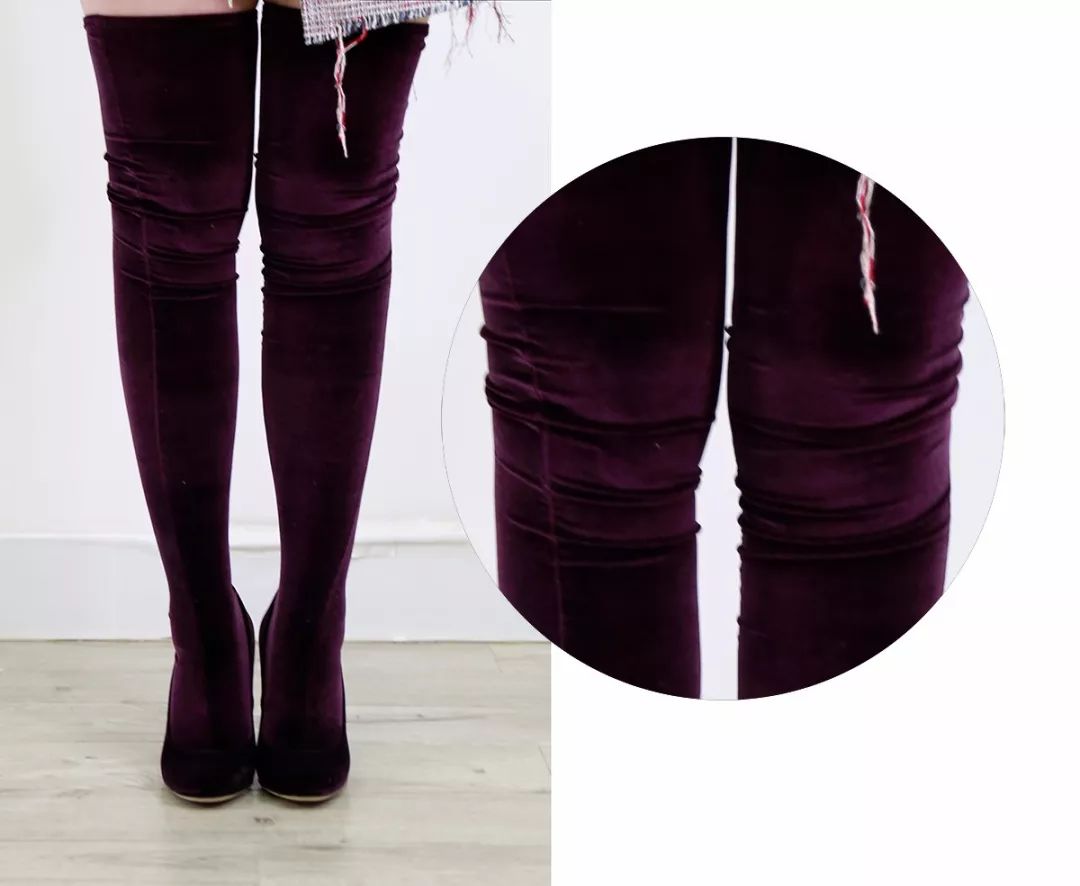 而实物本人?我承认这紫色真的非常高级,鞋子本身也很好穿。但,因为靴筒是单层的天鹅绒面料设计,穿上真的太像袜子了!特别容易各种褶皱,并且靴筒部分穿起来长什么样?完全取决于你的腿型……