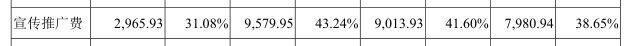 招股说明书显示,2014年到2017年1-6月份,其销售费用分别为2.06亿元、2.17亿元、2.22亿元和0.95亿元,占比营业收入均达到30%以上。其中,宣传推广费在2014年到2016年能达到近1亿元。