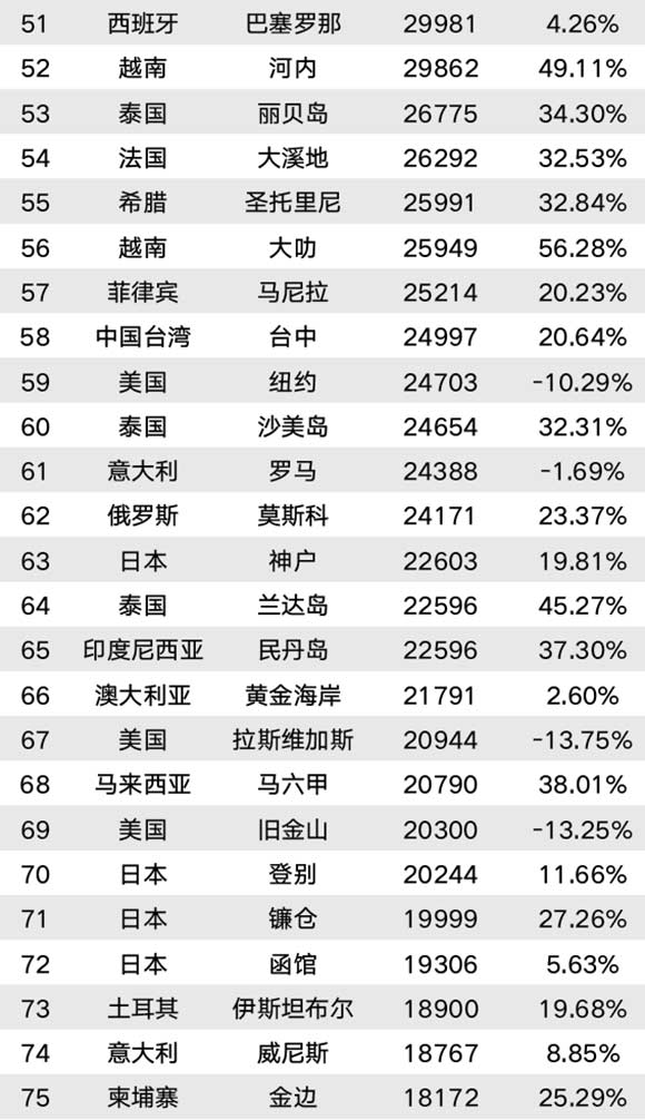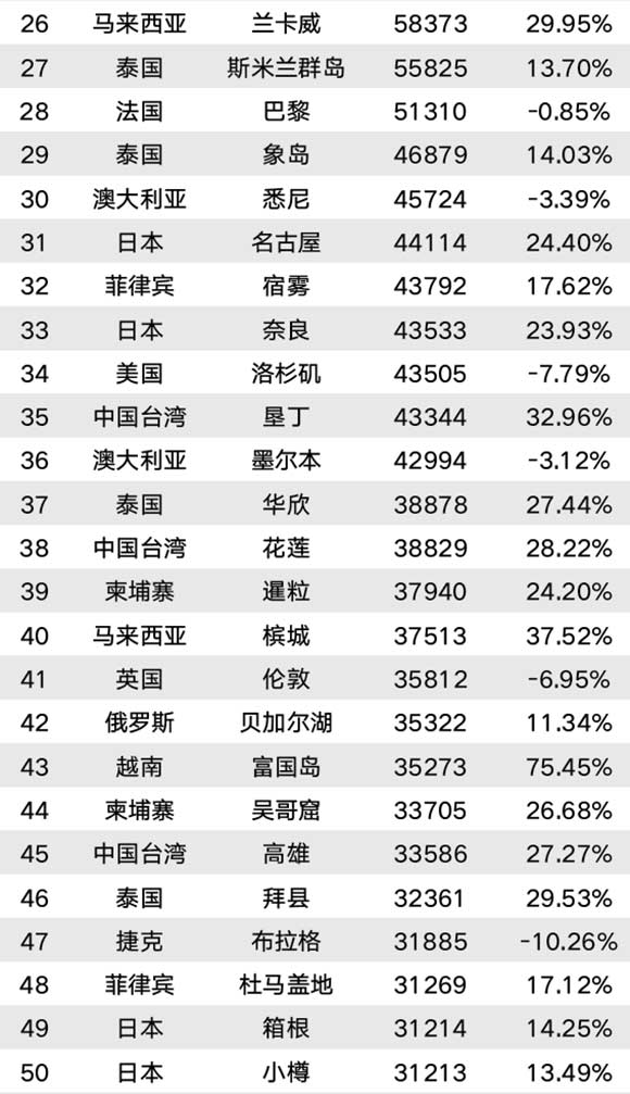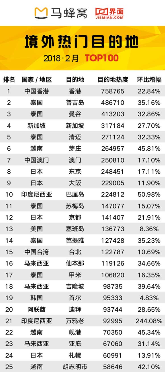 2月境外热门旅游目的地排行榜显示,排在前十的目的地分别是香港、普吉岛、曼谷、新加坡、清迈、芽庄、澳门、东京、大阪和巴厘岛。东南亚海岛仍是中国游客出境游的热门目的地。