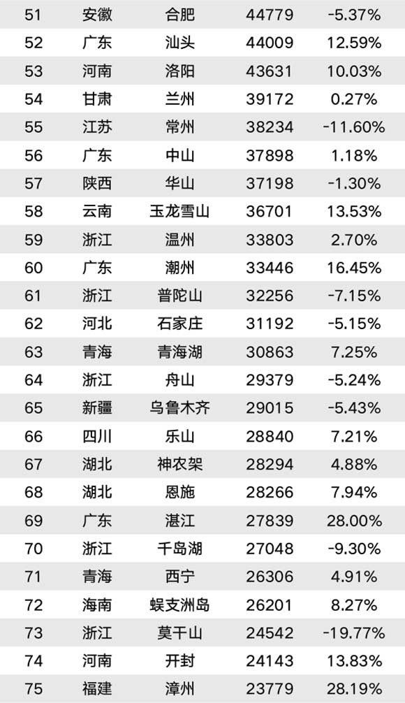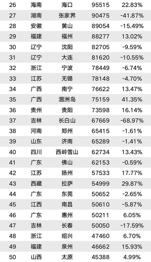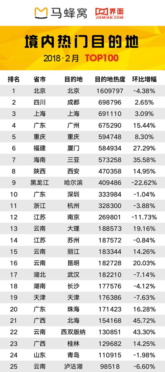 2月境内热门旅游目的地排行榜显示,排在前十的分别是北京、成都、上海、广州、重庆、厦门、三亚、西安、哈尔滨和深圳。