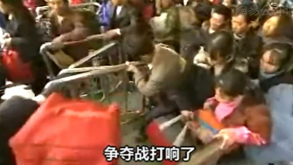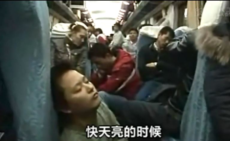 当时的镜头记录下了为了省钱在火车站广场打地铺的乘客;开始检票时一拥而上的人群;为了能上车从绿皮车厢窗口翻窗的乘客;还有在拥挤的车厢过道上睡觉的人。