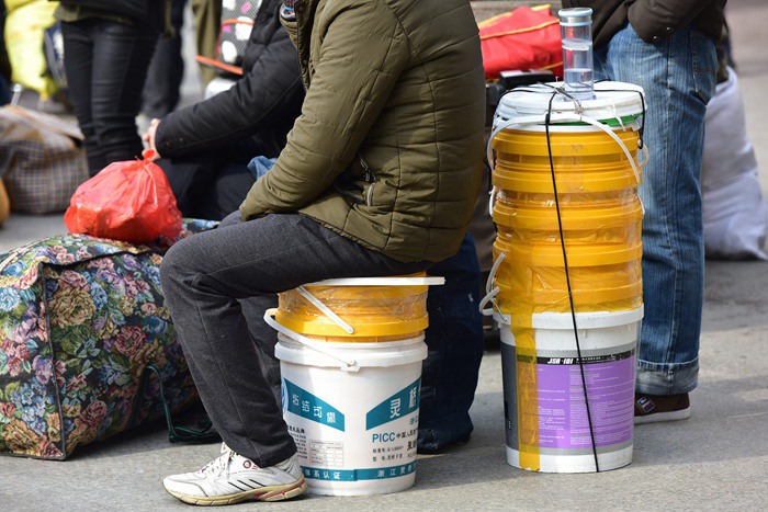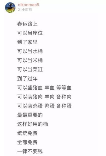 报道指出,微博网友发现有人带了20多个桶回家。这种神器在春运期间可谓万能:结实、能当凳子、桌子、旅行包、放鸡蛋、放米;带回农村可以用来装猪食、浇地;还有人用来腌咸菜。