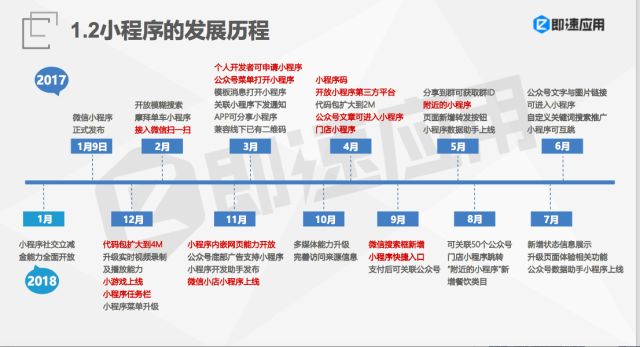 进入2017年下半年,微信官方在小程序能力开放上的步伐进一步加快。在2017年8月,小程序可关联公众号达到50个,9月微信搜索框新增小程序快捷入口,10月小程序的多媒体能力得到了进一步升级,而在11月,微信开放了小程序内嵌网页的能力,并推出了微信小店小程序。