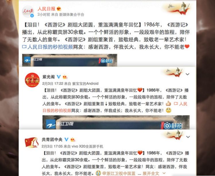 夹杂在全网“回家过年”的迫切情绪中,“西游记剧组重聚”空降热搜榜,“西游记罕见手稿曝光”更是引发全民怀旧高潮,引发人民日报、新华社、紫光阁、共青团中央等权威主流媒体纷纷发文点赞,联动效应不可小觑。