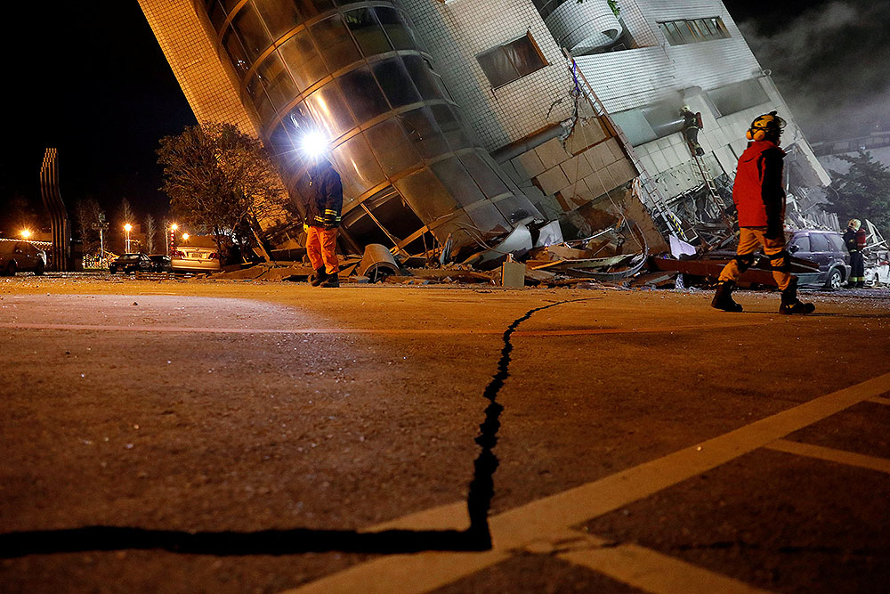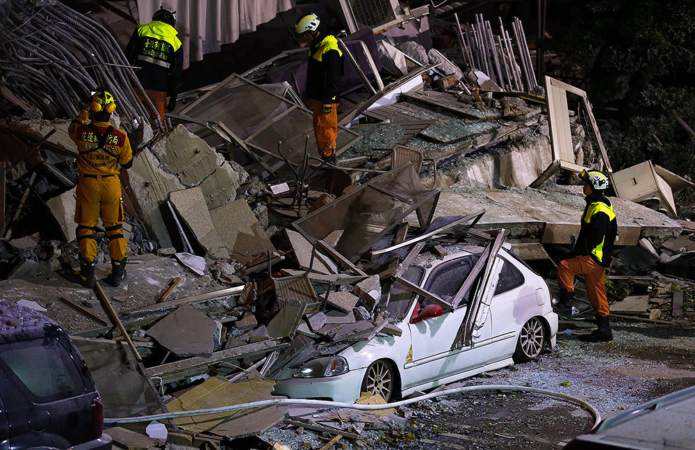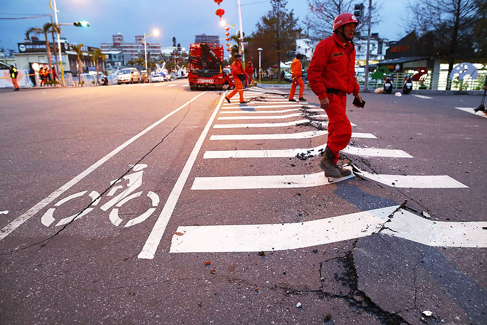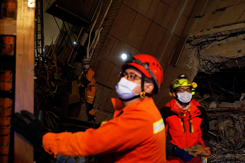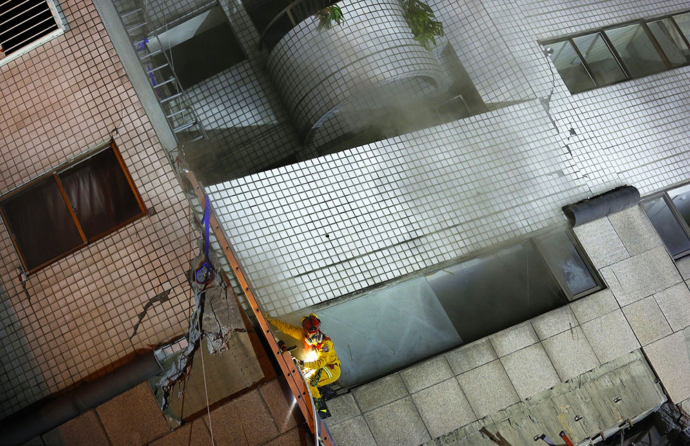 在台湾东部地区发生6.4级强震过后,救援人员正在花莲检查地震现场。