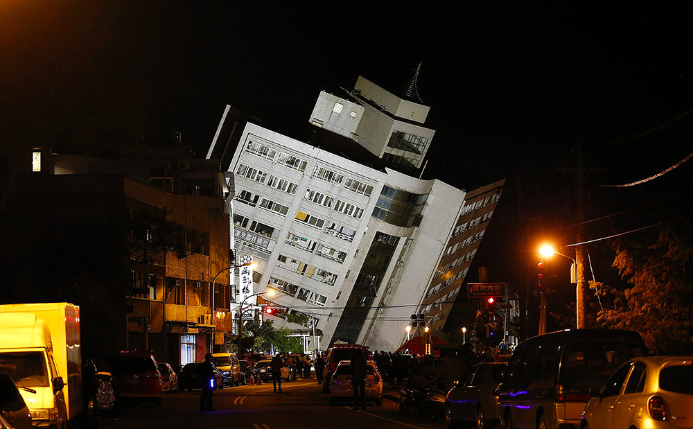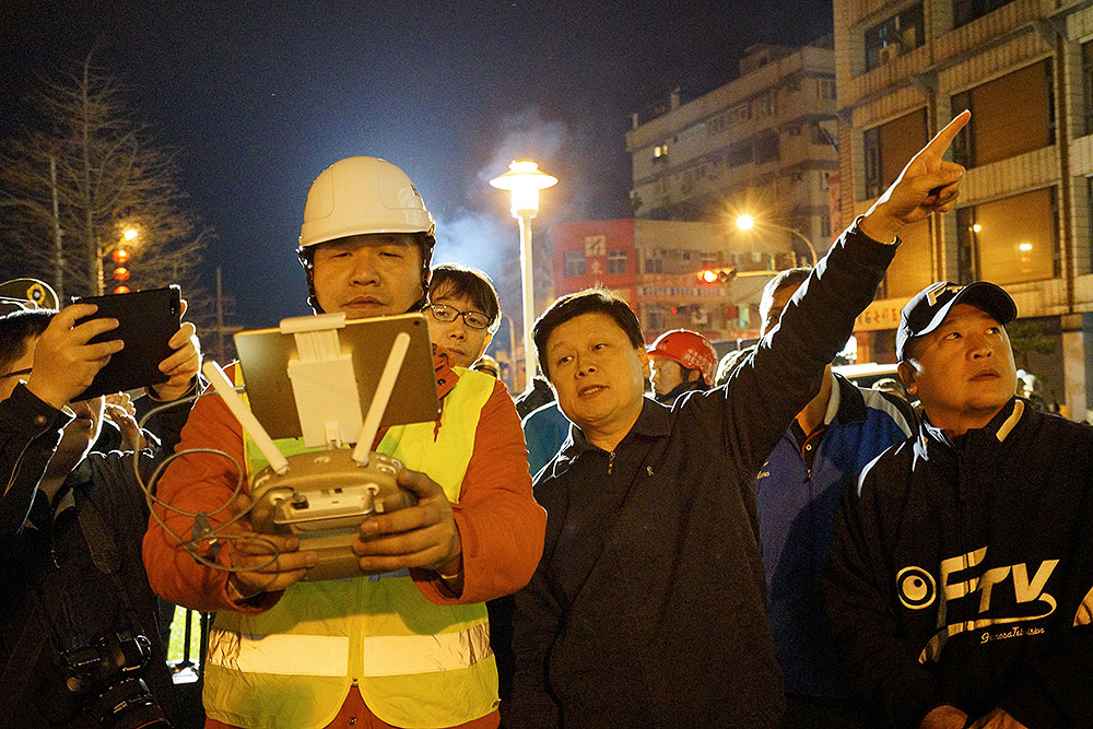 为了搜寻生还者,救援人员封锁了一幢楼的外部区域,这幢大楼在2018年2月7日凌晨的一场6.4级强震袭击台湾东部地区后,地基坍塌,朝一侧倾斜。政府在2月7日表示,这场6.4级地震致使楼屋坍塌并将人困在其中,造成4人死亡,200余人受伤。