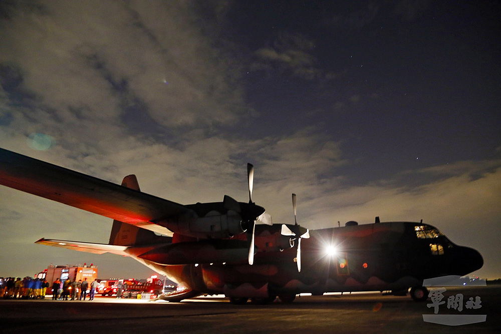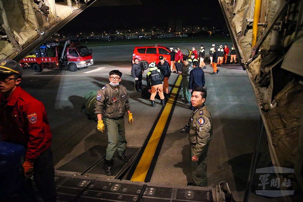 台湾军事通讯社在2018年2月7日提供的一份印刷品上显示,一架台湾军事C-130运输飞机准备由台北松山机场起飞,抢救台湾东部在2018年2月6日晚遭受6级地震的花莲人员,以及运输物资。
