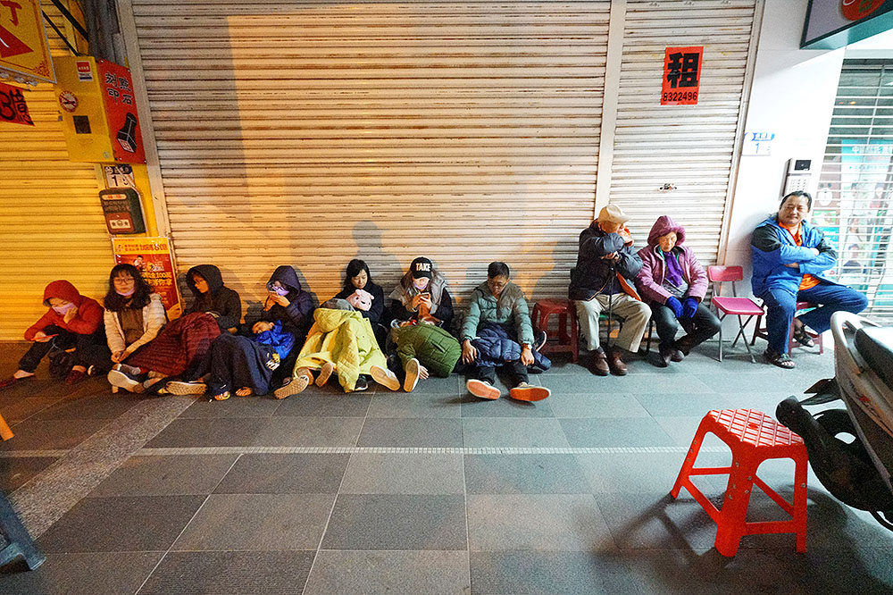在台湾东部的花莲,顾客们在2018年2月7日的强震之后从被摧毁的统帅饭店里逃了出来,并待在室外。政府表示,台湾东海岸的一家酒店在发生6.4级地震后倒塌。