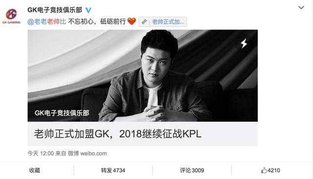 GK电子竞技俱乐部官方微博发布,原AG超玩会中单选手老帅正式加入GK电子竞技俱乐部王者荣耀分部,将在2018年春天代表新东家继续征战KPL。