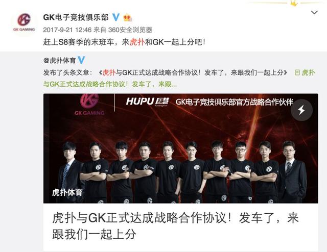 这个故事要从GK这家俱乐部说起。在2017年10月,虎扑旗下的动域资本以千万级的价格参与了GK俱乐部的天使轮融资,借此机会,虎扑的媒体部门与其旗下匡慧经纪公司也与GK方面达成了合作。
