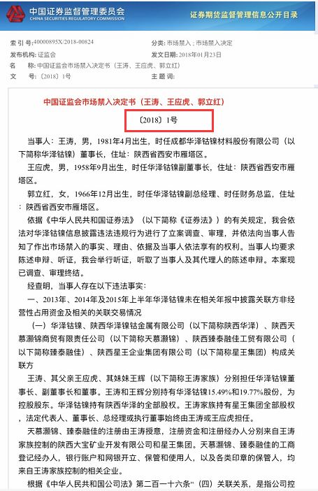 今天,证监会发布〔2018〕1号市场禁入决定书,对华泽钴镍80后董事长王涛采取终身证券市场禁入措施,对副董事长王应虎和财务总监郭立红分别采取10年、5年证券市场禁入措施。
