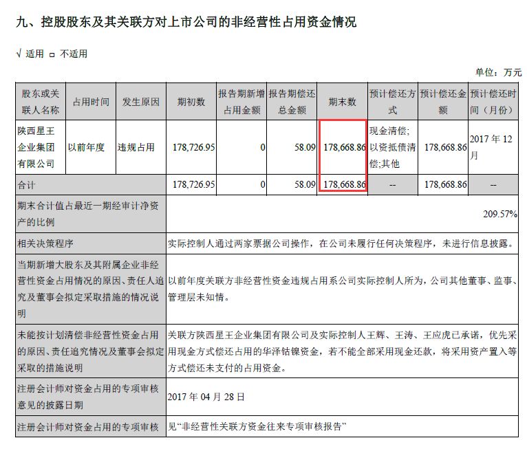 *ST华泽2015年报显示,公司其他应收款期末账面余额为18.64亿元,绝大部分为公司实控人旗下陕西星王等企业所欠,其中有14.97亿元为违规占款。2017年第三季度报告则显示,*ST华泽关联方违规占用资金17.87亿元,而其净资产才7.36亿元。