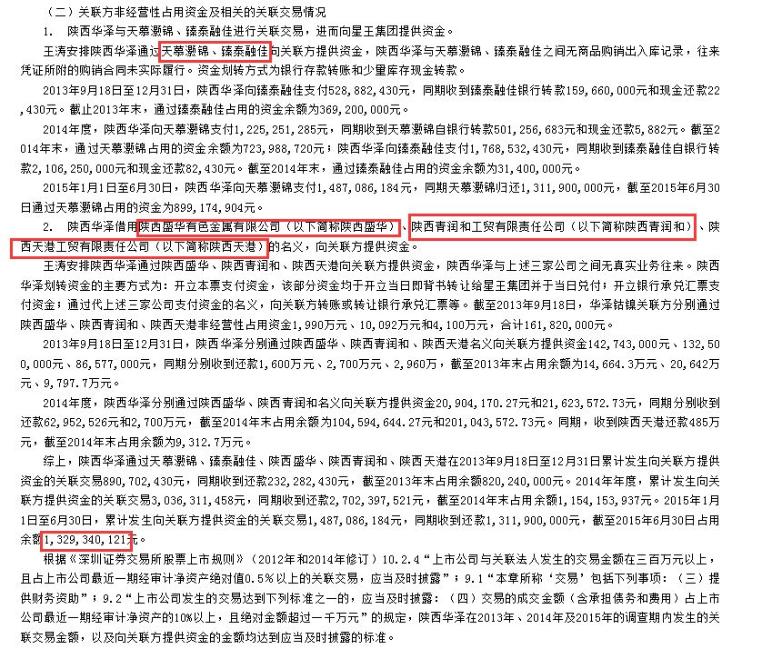 证监会指出,华泽钴镍持有陕西华泽的全部股权。陕西华泽通过天慕灏锦、臻泰融佳、陕西盛华、陕西青润和、陕西天港,截至2013年末占用资金余额8.20亿元;截至2014年末占用余额11.54亿元;截至2015年6 月30日占用余额13.29亿元。