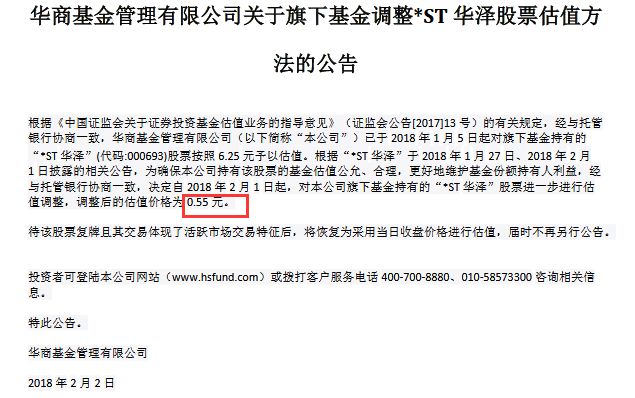 2月2日,华商基金下发公告称,自2018年2月1日起,对公司旗下基金持有的*ST华泽股票进一步进行估值调整,调整后的估值价格为0.55元/股,相当于61个跌停。
