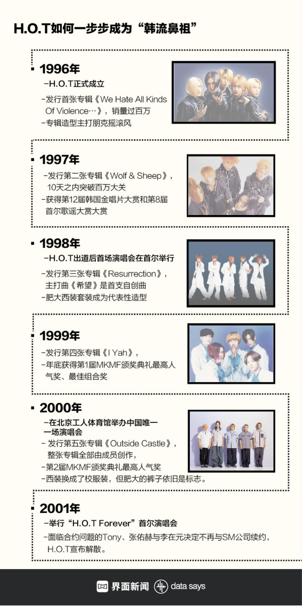 组合寿命不算太长——1996年7月出道,2001年解散。但在这6年间,他们出了5张专辑,几乎年年都斩获韩国歌谣界最大奖,首创了有应援色、会服、口号的正规追星潮流,开了4次国内演唱会,场场门票都在1小时内售罄,也在大陆和台湾地区开过两次演唱会,是来到中国开独立演唱会的韩国组合。