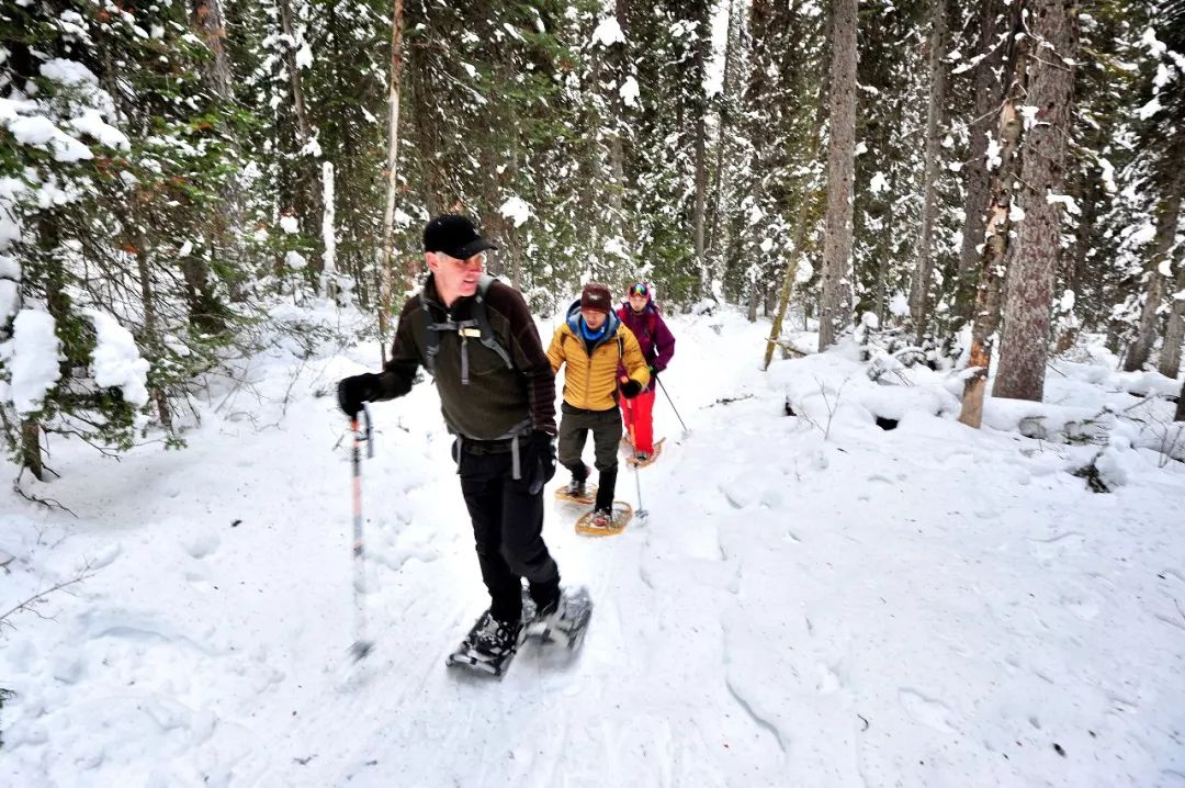 露易丝湖的冬天并不静寂,除了滑雪,附近的山林里可以找到许多乐趣,狗拉雪撬和大脚鞋雪地探险便是其中最主要的两项。湖附近的积雪更深,雪地里除了几行动物的足迹外,便是洁白的一片,一脚踏下去,雪已经没过膝盖。最美妙的是不冷,刚刚零下几度的温度让人忘记这是冬天。