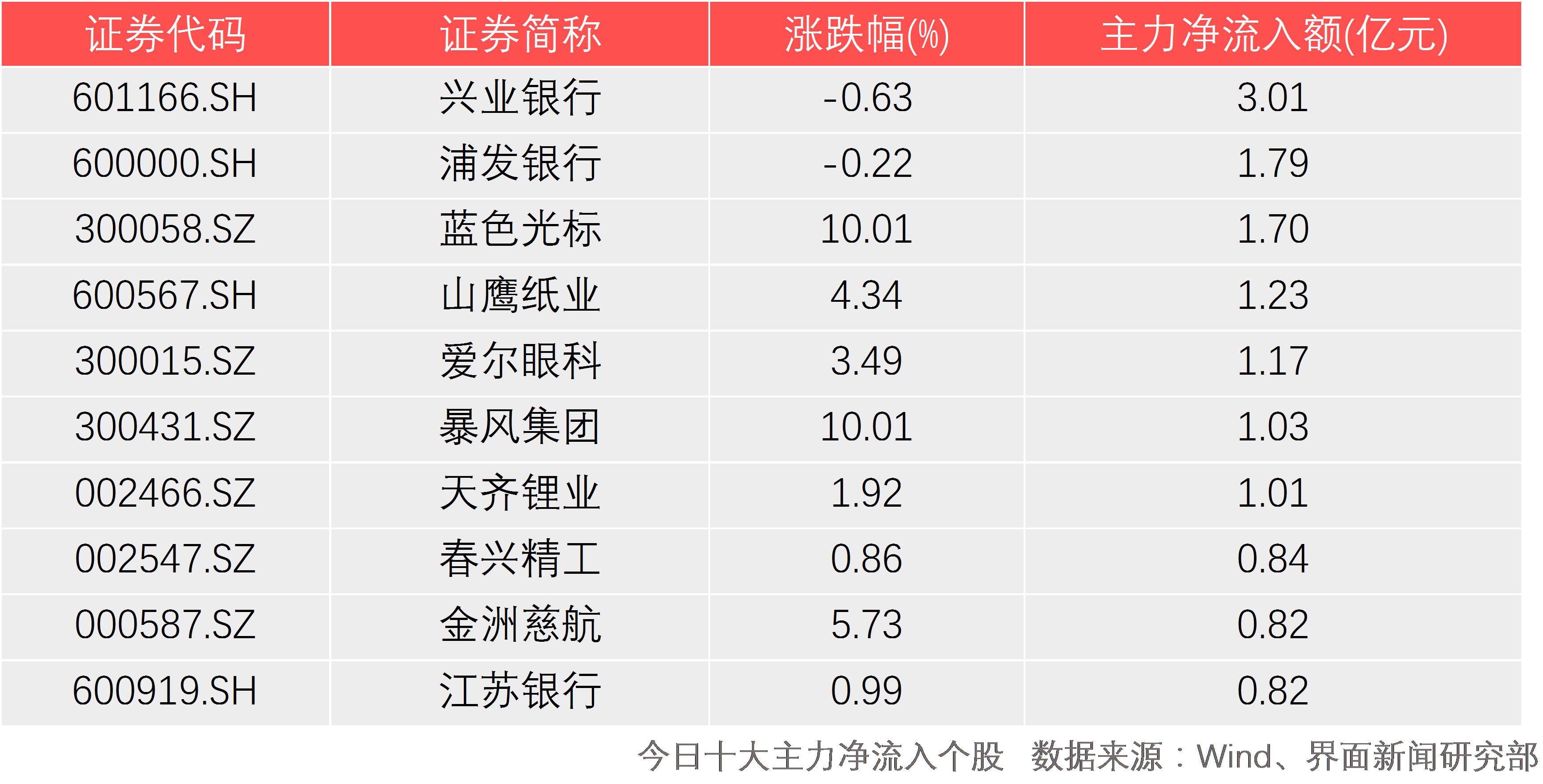 从个股表现上来看,今日主力资金净流入排名前三的是兴业银行(601166.SH)、浦发银行(600000.SH)、蓝色光标(300058.SZ),分别净流入3.01亿元、1.79亿元、1.70亿元。