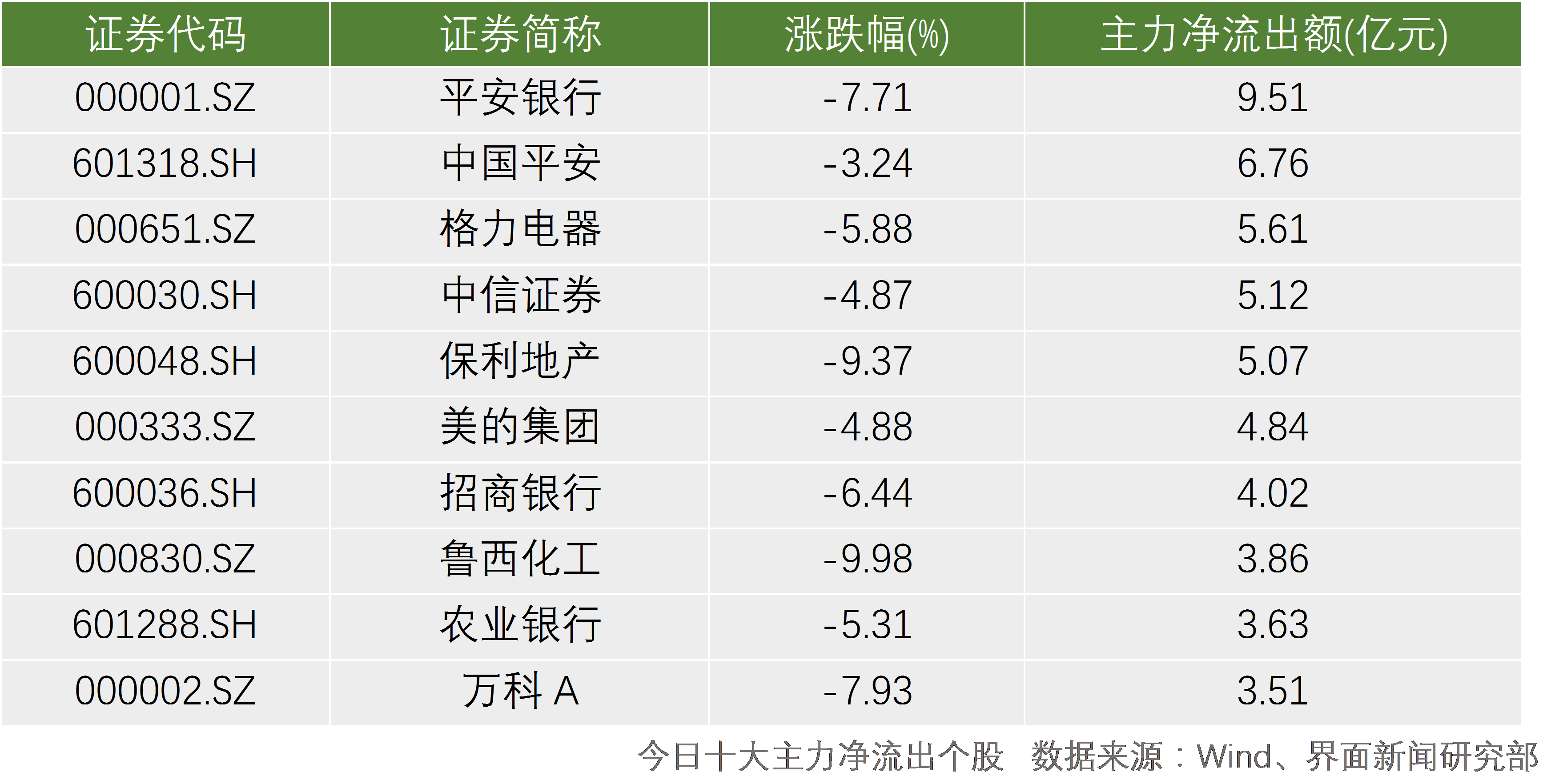 平安银行(000001.SZ)、中国平安(601318.SH)、格力电器(000651.SZ)成为主力资金今日重点抛售对象,分别净流出9.51亿元、6.76亿元、5.61亿元。今日银行股在主力资金流向上出现分化,兴业银行、浦发银行、江苏银行(600919.SH)获得主力资金流入,而平安银行、招商银行(600036.SH)、农业银行(601288.SH)则遭遇主力资金流出。