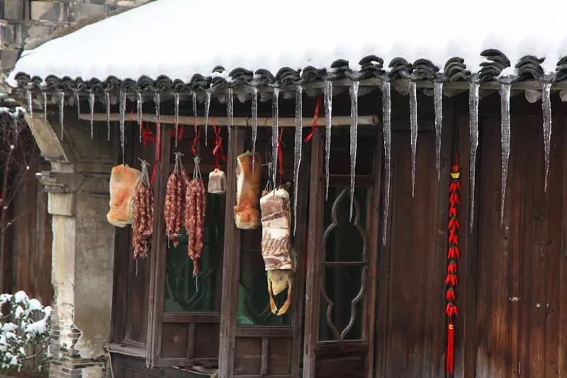 老房子、石板路,红灯笼,纯手工制作的咸香香肠、泛着光泽的腊猪蹄、还有那挂在杆子上沐浴阳光的腊鸭腊鸡,都是最地道的古镇年味。
