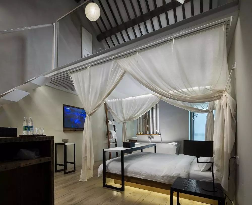 客栈分为3层,9间客房,每一间客房都各有特色。开放式的空间布局,现代与复旧的融合碰撞。白色墙面与浅色地板的照映,精挑细选的简约设计家具,还有唯美的纱幔垂于各处,每处线条以及灯光都十分考究。