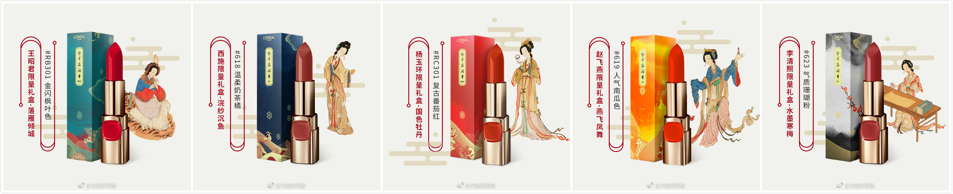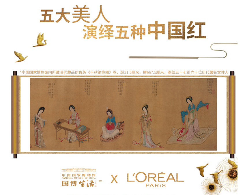 故宫和国际大牌的合作迟迟没有下文,这个创意却被人捷足先登——国家博物馆和巴黎欧莱雅合作了。二者合作推出了5款限量口红礼盒,灵感来自国博馆藏的清代藏品仿仇英《千秋绝艳图》,巴黎欧莱雅的几款普通色号的口红披上古典美女的外衣后似乎也沾上了仙气:赵飞燕、王昭君、西施、杨玉环、李清照都来代言了。
