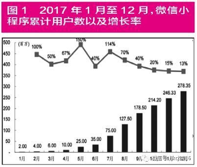 根据咫尺网络和阿拉丁数据,2017年1月至12月,小程序积累用户为2.78亿,但在累计用户不断增长的同时,其增长率却呈现出逐渐下滑的趋势。而且与高达9.80亿的微信月活跃用户数(2017年三季度数据)相比,小程序在未来依然有很大的渗透空间。正是在这样的背景下,以“跳一跳”为代表的小游戏被外界视为撬动小程序渗透率的重要“杠杆”。在不少业内人士看来,虽然小程序今年1月份的累计用户数量尚未披露,但小游戏的问世,无疑把腾讯公司推到了下一个市场风口。(见图1)