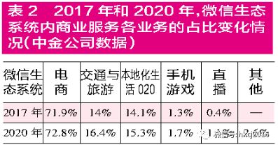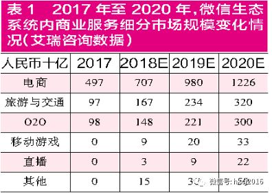 对此,中金公司研究部以电商业务为例,认为小程序有望成为电商商家在微信生态系统内的主要平台,而且很可能在未来“竞食”部分第三方电商工具市场并向大部分中长尾商家渗透。中金公司预计,微信生态系统内商业服务市场2017年的总规模约为6910亿元,2020年有望达到1.95万亿元,复合年增速达到41%。其中,电商将成为微信生态系统中的重要组成部分。根据艾瑞咨询数据,电商业务市场规模将由2017年的4970亿元增长至2020年的1.226万亿元。(见表1、表2)