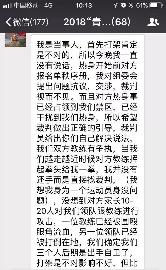 就在双方都准备离开场地时,两位八喜球员的家长却挑起了双方第二回武力PK!他们看到自己孩子被欺负后,竟然偷偷跑到湘涛替补席旁殴打引发冲突的一名球员,随后遭到球员围殴,八喜球员马上加入战局,那叫一个惨烈!事后多名球员受伤,一名八喜球员甚至鼻梁骨骨折,在社会上引起轰动。