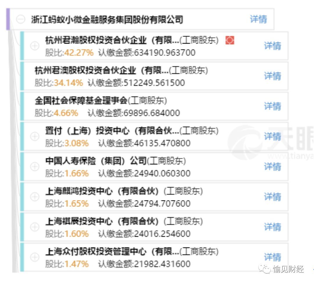 接着愉小编再为大家“天眼查”扒一下,蚂蚁金服在本次股权变更前的股东都有谁: