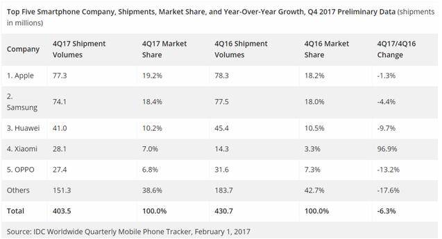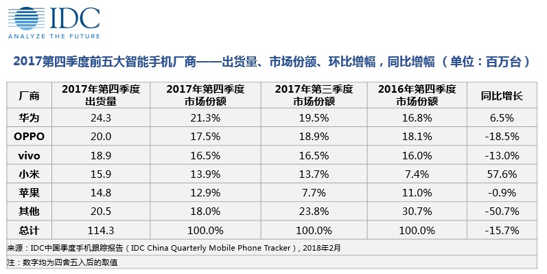 这里我们不妨先看看小米手机去年的基本表现,为了公平起见,无论是全球还是中国手机市场,我们均引用知名市场统计公司IDC的数据。从全球智能手机市场看,去年第四季度和全年,小米手机出货量分别同比增长96.9%和74.5%。