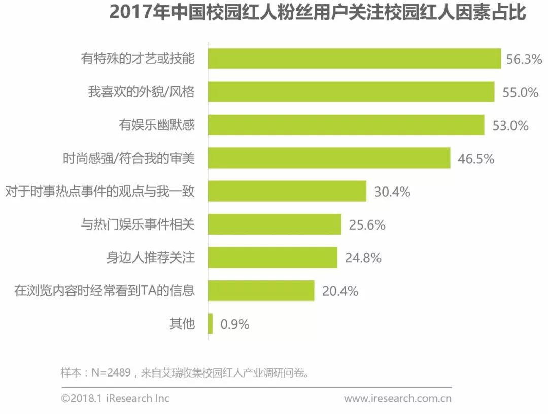 另外,从影响用户关注校园红人的因素占比来看,颜值外形因素虽依旧排名较高,但已不是唯一必要因素。有特殊的才华和一定的幽默感才是吸引粉丝的关键。