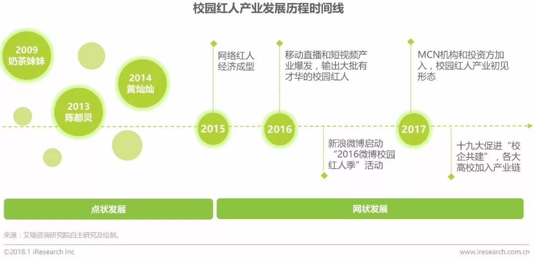中国校园红人产业整体的发展经历了一个从点状到网状,从零星到规模化的过程,早期人物的走红多为不经意之间的零星产出现象,这些案例所引起的强烈反响令投资方和机构平台看到了商业潜力,他们将产出的各个环节点连接起来,使得其逐渐形成一个完整的规模化产业。“校园+网络”是最早期校园红人的概念,因此“奶茶妹妹”的出现可以看作为一个校园红人的雏形,后来的最美校花陈都灵、黄灿灿等也都是早期校园红人的代表人物。