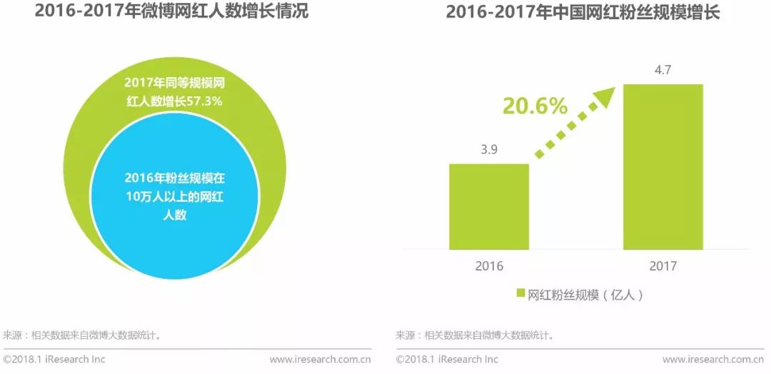 2017年,粉丝规模在10万人以上的网红人数较2016年增长57.3%;与此同时,2017年中国网红粉丝总人数在原有的庞大基础上继续增加,达到4.7亿人,环比增长20.6%;