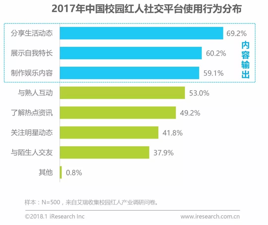 在中国校园红人对于社交平台的选择中,用户流量最大、扶持资源最多的互动类平台占据首位,随后以直播、短视频等中心化社交平台为主。艾瑞分析认为,校园红人早期的走红多起源于中心化社交平台,通过展示自我特长和才艺积累粉丝,随后在微博等互动类社交平台上进一步寻求更多的流量资源。而校园红人的社交平台使用行为也非常典型地以内容输出为主,包括分享生活动态、展示自我特长、和制作娱乐内容等。