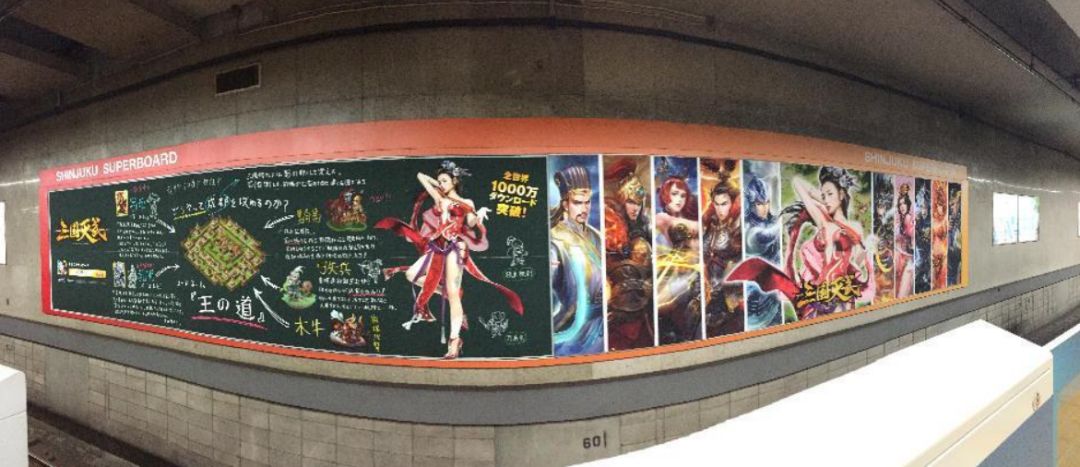 6waves也非常注重线下的推广,上图为《三国天武》在东京-新宿车站月台主要区域的超级广告牌,新宿站是世界最大车站,日客流364万,共178个出口,铁路车站广告牌也为游戏带来了可观的下载量,并且游戏口碑得到进一步宣传。