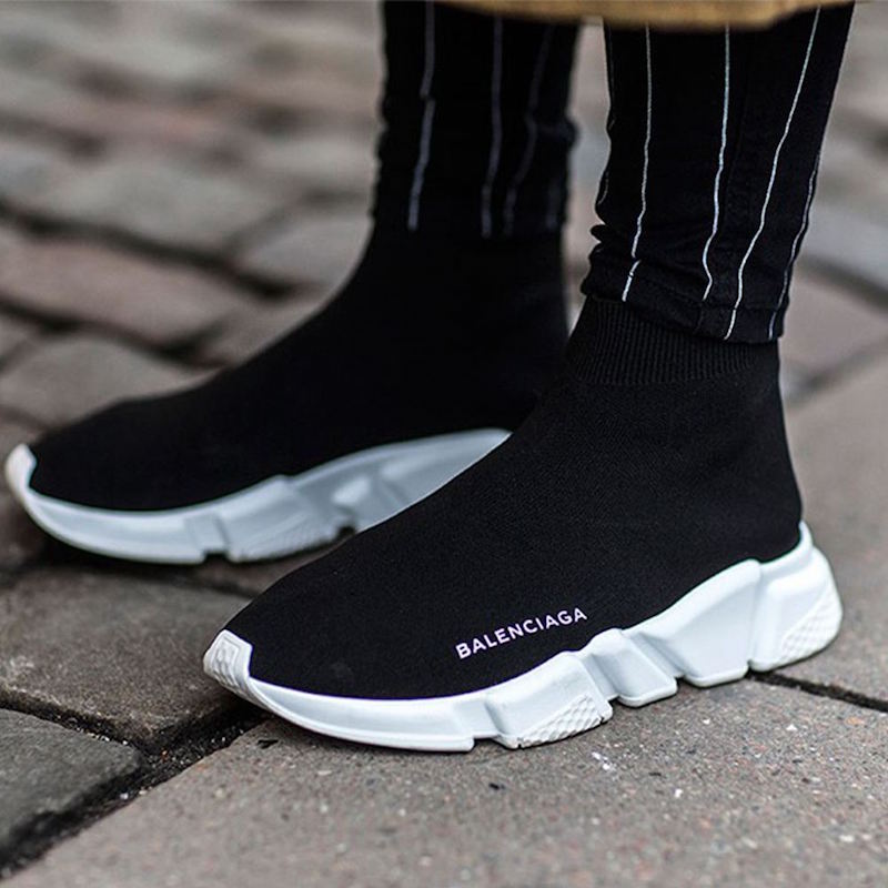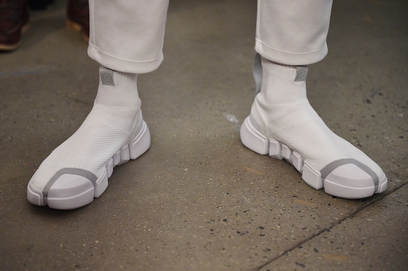 模特脚下的这双白色袜子鞋(上),和Balenciaga大热的袜子鞋(下)“撞脸”。