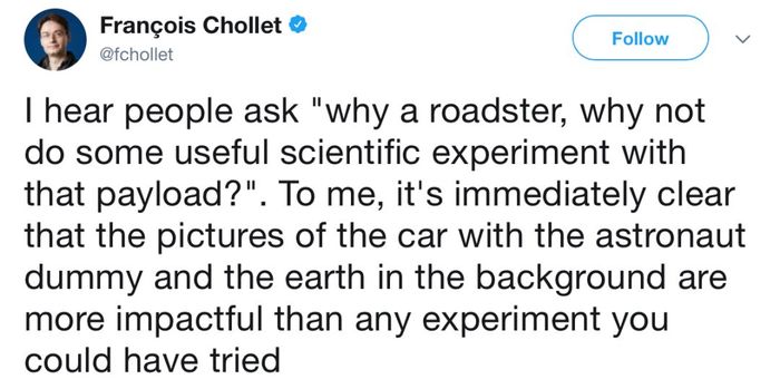 可千万不要低估一场秀的作用。谷歌大牛、Keras的创作者Fran ois Chollet就在昨日发推特说“宇航员假人和地球背景下的汽车照片比任何你可能做过的实验有用。”