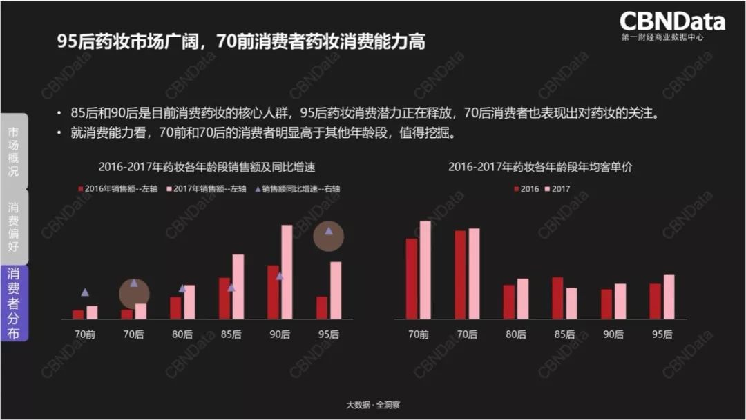 “颜值即正义”已经是所有女性的共识,上了年纪的妈妈们对于护肤保养最是看中。CBNData此前发布的《天猫美妆消费者人群变化趋势》显示,85后和90后是目前药妆消费的核心人群,但70前消费者药妆消费能力明显高于其他年龄段。