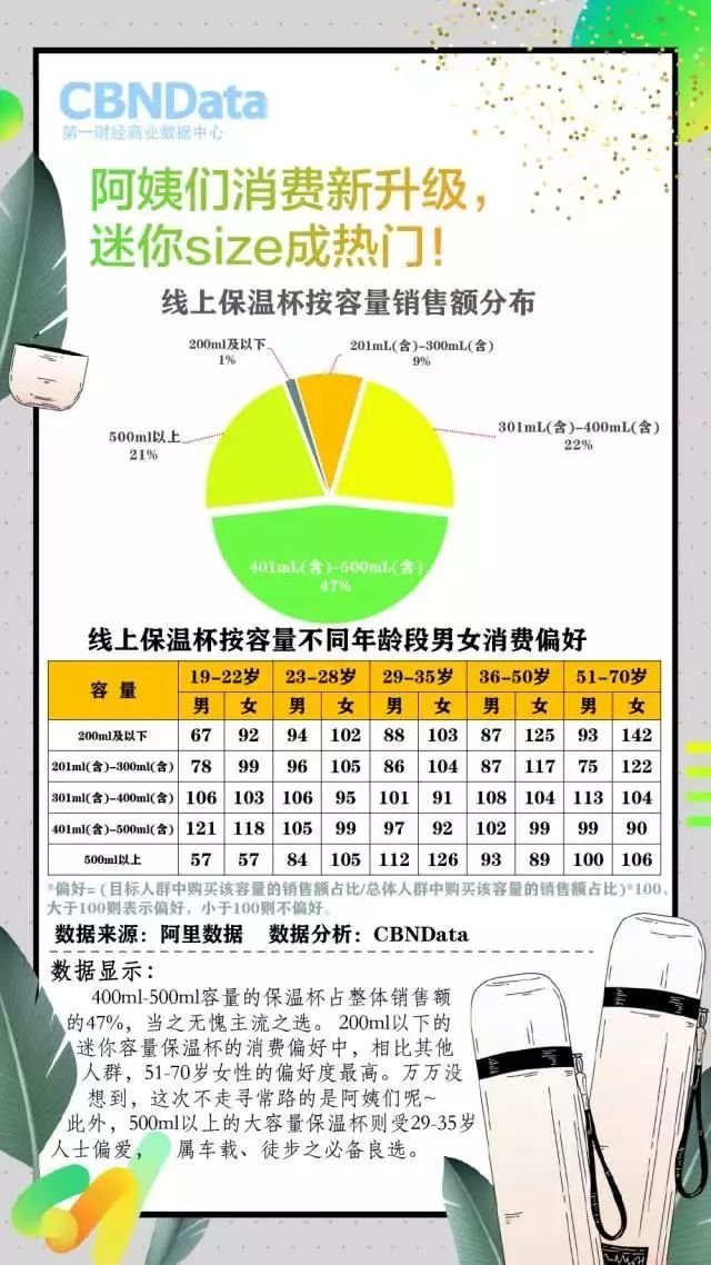 当然,除了化妆品,其他出其不意的贴心小礼物,也许更能融化这“新”妈妈的心。从CBNData此前发布的《2017线上保温杯相关消费研究》中可以看到,200毫升以下的迷你容量保温杯仅占整体销售额的1%。但从不同年龄段消费者容量偏好来看,这个规格恰恰获得了51-70岁女性的大爱。估计是阿姨们去广场跳舞方便随身携带,所以枸杞+迷你保温杯的养生组合来一套,你就从半个儿子向整个儿子的贴心程度跨出了质变的一步。